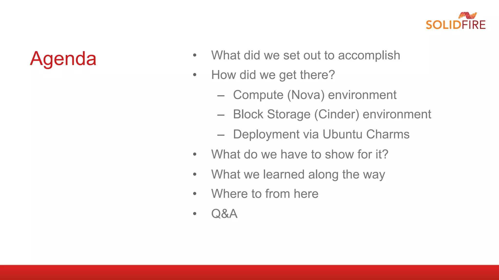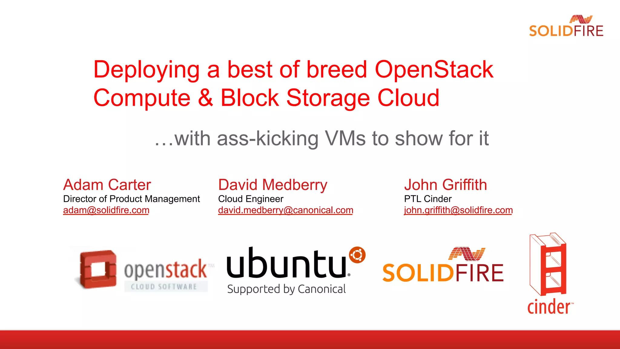 This document outlines a project to deploy a production-ready OpenStack compute and block storage environment using Ubuntu, OpenStack, and SolidFire technologies. Key goals were to provide a reference architecture emphasizing predictable performance, quality of service, and ease of use. The deployment utilized Nova, Cinder, Swift and Ubuntu Charms. Results included an estimated 600-1200 virtual machines and 210-415 IOPS per application instance on a SolidFire cluster. Lessons learned included the ongoing challenges of OpenStack deployment and the need to adjust defaults and be prepared for configuration changes between releases.