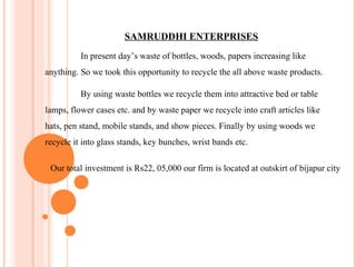 Samruddhi Enterprises recycles waste materials like bottles, paper, and wood into products like lamps, flower vases, crafts, and home decor. It has an investment of Rs. 22,05,000 and is located outside of Bijapur city. The business competes with local NGOs but aims to gain market share through reasonable prices and exhibition of its recycled products. Financial statements show increasing sales and profits over three years.