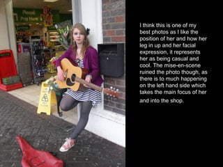 The document discusses several potential photos for the front cover of a music magazine. The first photo is praised for the subject's pose but criticized for too much clutter in the background. The second photo shows the subject holding a guitar, representing her career in music, but her facial expression is deemed unprofessional. The third photo experiments with a microphone prop but is slightly blurry with a messy background. The fourth photo features a train map and money representing the subject's past as a street performer, clearly showing her success through an earring. The fifth photo receives no criticism for its angle, lighting or background of train station doors with flowers. This fifth photo is selected as the favorite for the magazine cover due to its relaxed, relatable scene