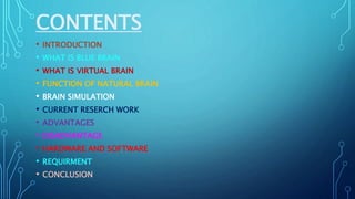 The document discusses the concept of a virtual brain called Blue Brain. It describes Blue Brain as a machine that can function like the human brain by taking decisions, thinking, responding, keeping memories, and having feelings and emotions. The document outlines IBM's current research project to develop a virtual brain within 30 years that could upload a person's intelligence, knowledge, and skills by using nanobots to monitor and map the activity of the natural brain. Some advantages mentioned are being able to remember things without effort and preserving a person's intelligence after death, while a disadvantage is potential dependence on computer systems.