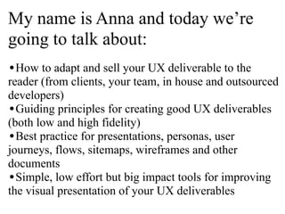 This document provides a summary of an expert presentation on best practices for UX deliverables. Some key points discussed include: