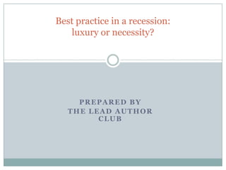 This document discusses using best practices during a recession. It notes that while new funding is scarce during a recession, using optimal processes, skills, tools and information through best practices can help organizations prioritize work and avoid waste. The document provides an overview of a session on why and how to embed best practices during a recession. It also includes characteristics of best practices and recessions, and discusses using best practices for portfolio, program and project management.