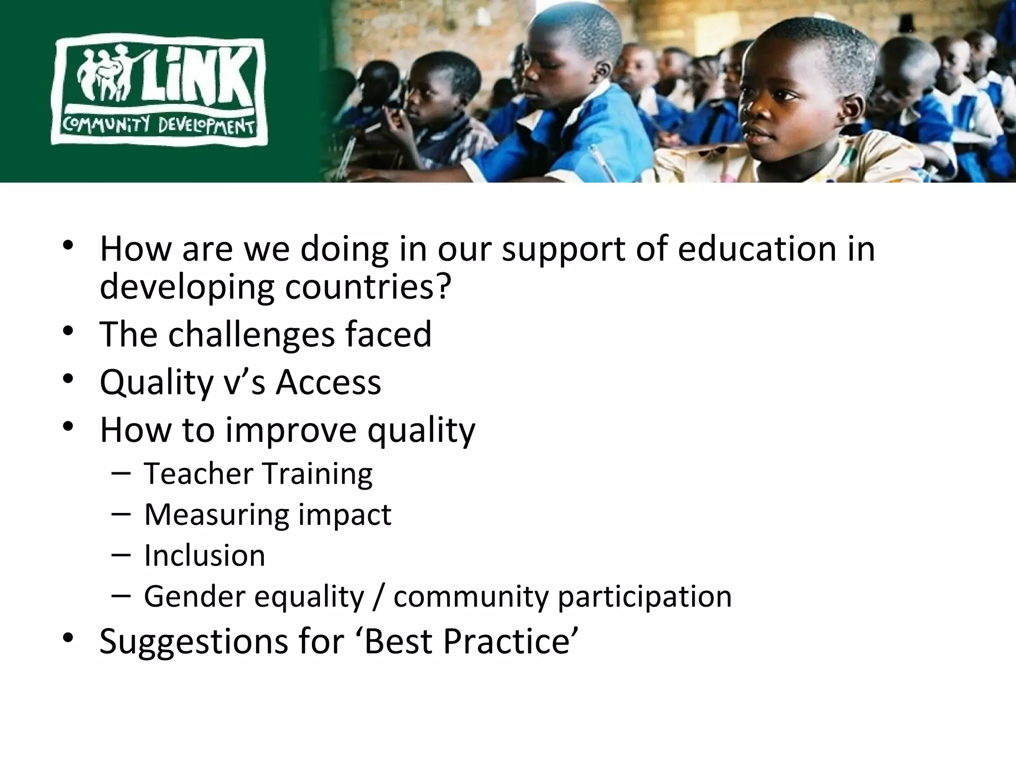 This document discusses best practices in education in developing countries. It addresses challenges such as quality versus access, teacher training, and inclusion. Tanzania is provided as an example of a country achieving the goal of universal primary education, but still facing quality issues. Best practices are defined as being holistic, sustainable, addressing government priorities, and having long-lasting impact. Examples provided include FAWE supporting girls' education, an organization helping orphans in Tanzania, and Link Community Development evaluating school performance to improve quality.