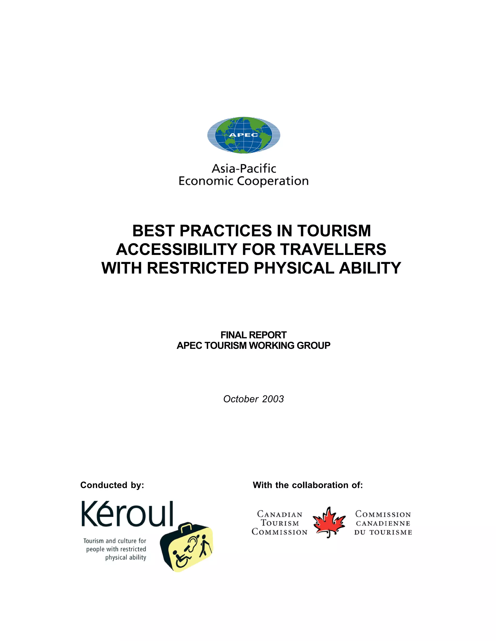 This document provides a final report from the APEC Tourism Working Group on best practices for tourism accessibility for travelers with restricted physical ability. It conducted a survey of member economies to identify positive examples of accessibility in transportation, accommodations, tourism sites, travel planning, and customer services. The report aims to promote greater accessibility, raise awareness of the importance of inclusion, harmonize accessibility standards, and facilitate information exchange among members. It analyzes the examples collected according to categories and criteria to evaluate their potential transferability to other economies.