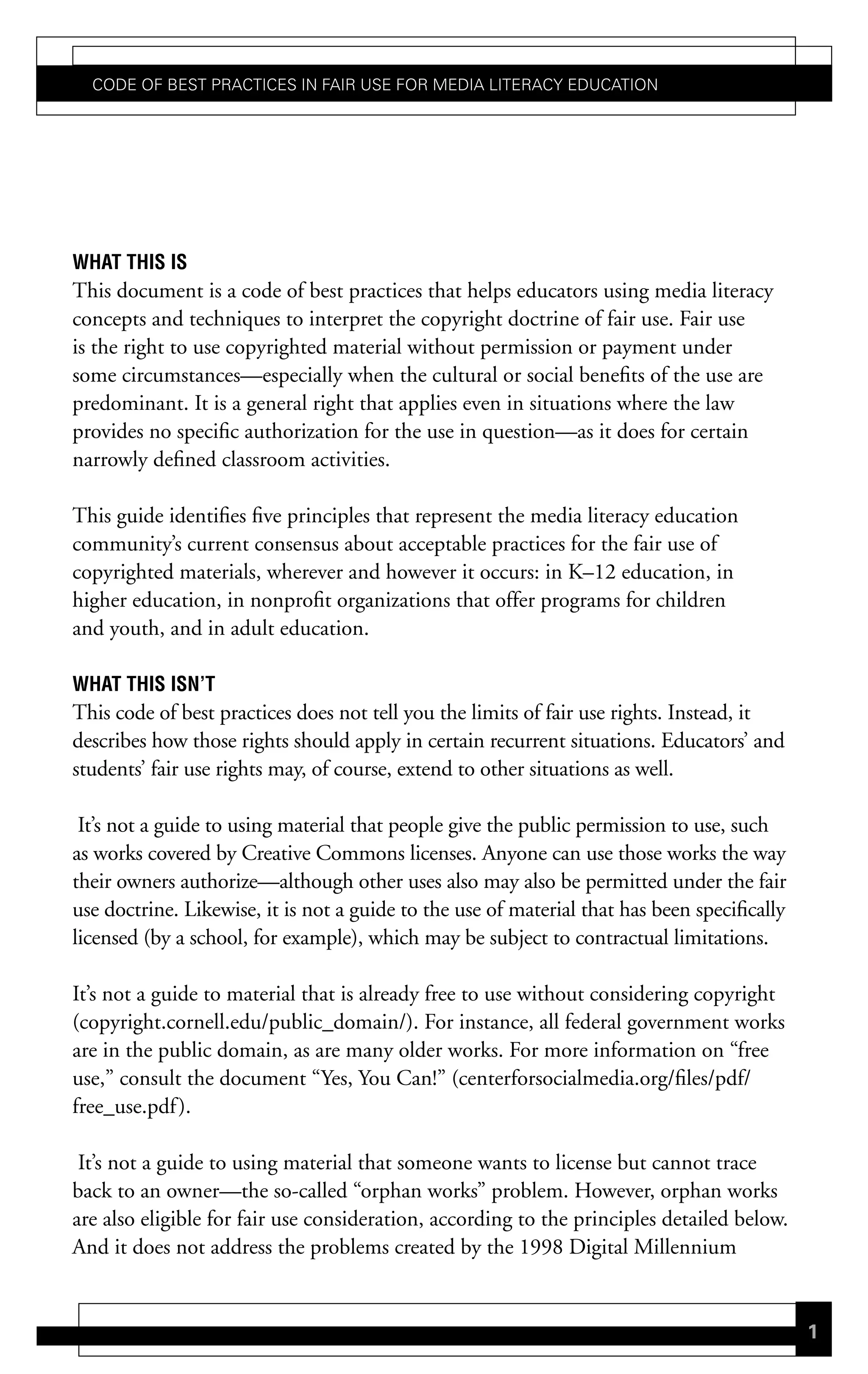 This document provides a code of best practices for educators using fair use of copyrighted materials for media literacy education. It was created by a coalition of educational organizations through a collaborative process. The code identifies five principles to help educators interpret fair use rights in common educational situations involving media literacy. It aims to address confusion about copyright among educators by clarifying acceptable fair use practices for teaching and learning.