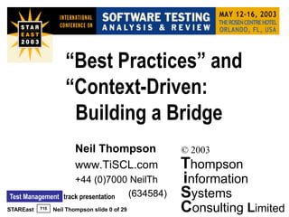 The document outlines a presentation on bridging the gap between "best practices" and "context-driven" approaches to test management. It discusses learning objectives around understanding each perspective and applying Goldratt's theory of constraints thinking tools. The presentation will cover examples of using these tools to analyze testing practices and determine what is most appropriate based on different project contexts.