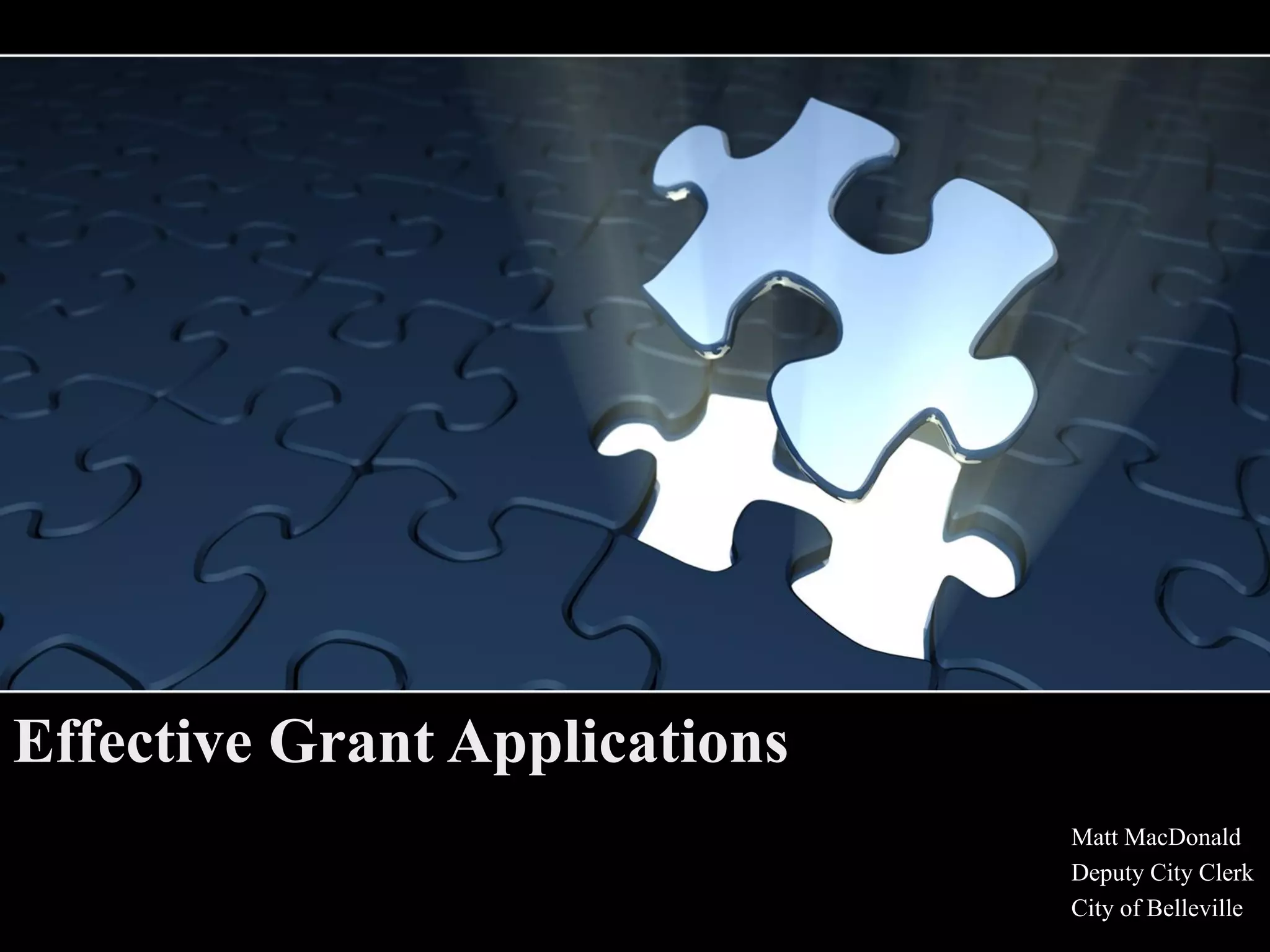 This document provides tips for developing effective grant applications. It advises to plan strategically, research funding programs, develop relationships with government officials, engage partners and stakeholders, highlight the positive impacts of the proposed project, follow application instructions carefully, proofread, attach all required documents, budget accurately, and clearly demonstrate need. Common reasons for unsuccessful applications include failing to show need or relevance to the funding body's goals. Potential funding sources mentioned include provincial grants portals and programs.
