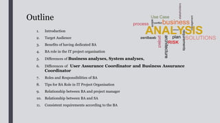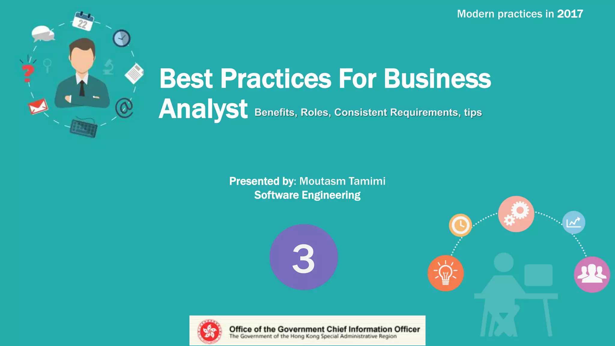 The document outlines best practices for business analysts in 2017. It discusses the benefits of having dedicated business analysts on projects and their roles. It provides tips on the relationships between business analysts and project managers, as well as consistency in requirements elicitation. The presentation was given by Moutasm Tamimi and provides an introduction to business analysis practices.
