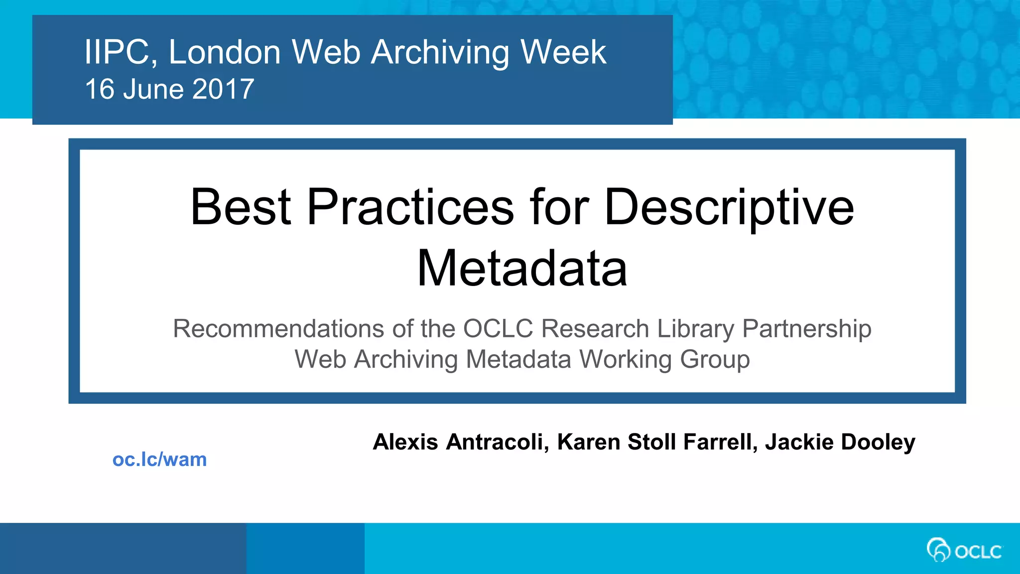 The document discusses the challenges in web archiving, particularly the lack of best practices for descriptive metadata that hinder discoverability and use. It presents recommendations from the OCLC Research Library Partnership Web Archiving Metadata Working Group, focusing on community-neutral and standards-neutral metadata best practices. The report outlines a data dictionary with essential elements for describing archived websites, addressing user needs and various methodologies to enhance access and understanding of web archives.