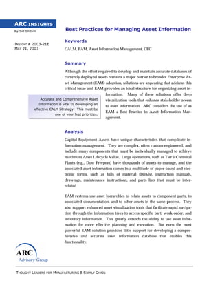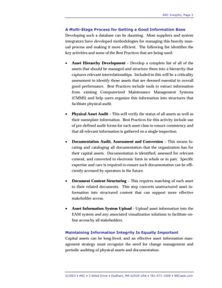 This document discusses best practices for managing asset information. It outlines a multi-stage process for developing an accurate asset database, including asset hierarchy development, physical asset audits, documentation audits, and uploading information to an enterprise asset management system. It also emphasizes the importance of change management and periodic auditing to maintain data integrity over the long term. The document recommends that organizations develop an internal strategy to improve their asset data and monitor best practices in this area.