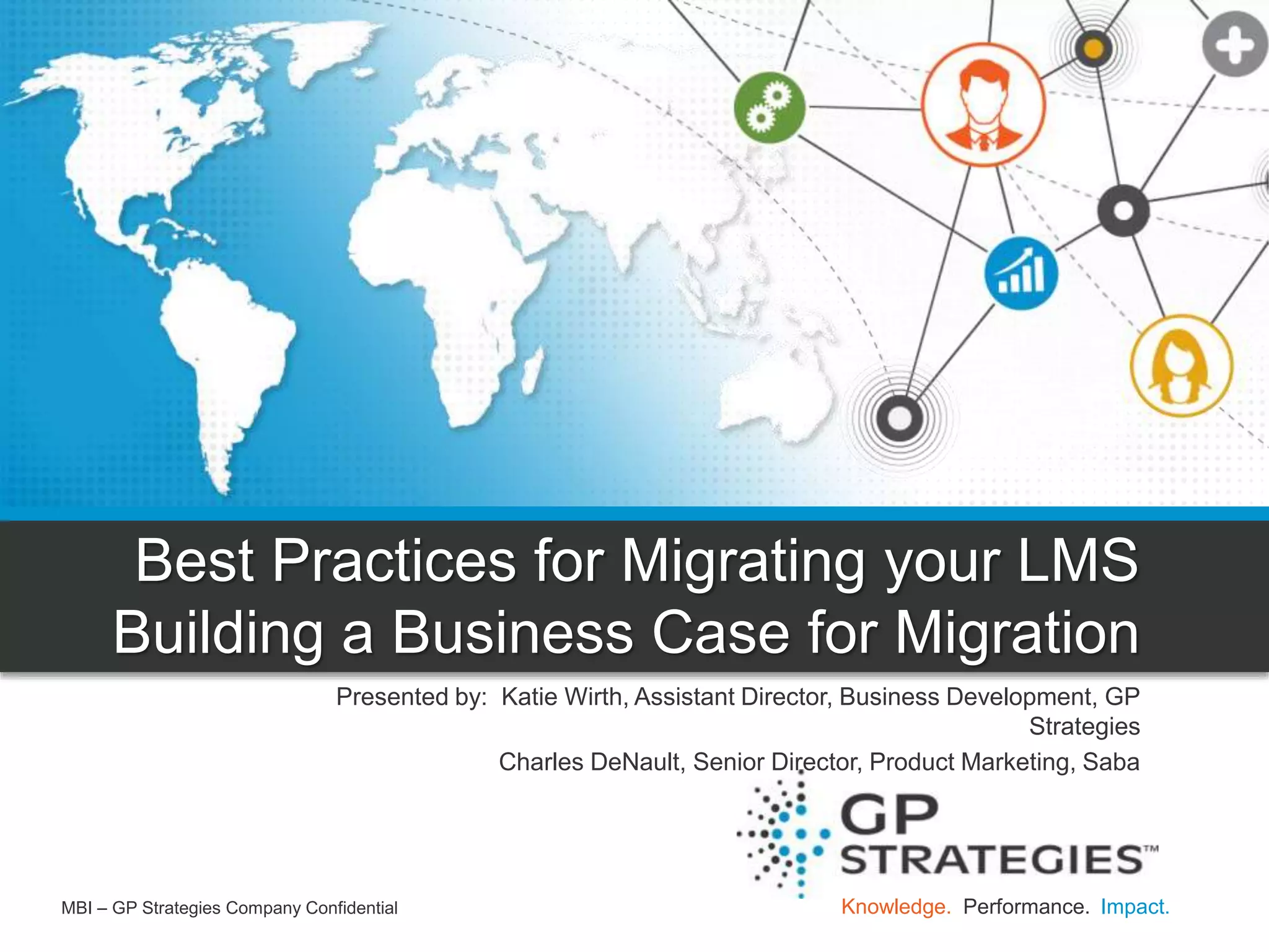 The document discusses best practices for migrating a learning management system (LMS), including building a business case to justify the need to upgrade, selecting a new LMS through a thorough evaluation process, and planning a migration strategy that focuses on data migration, change management, and a successful launch of the new system. The presentation provides an overview of the LMS migration process and common challenges organizations may face.