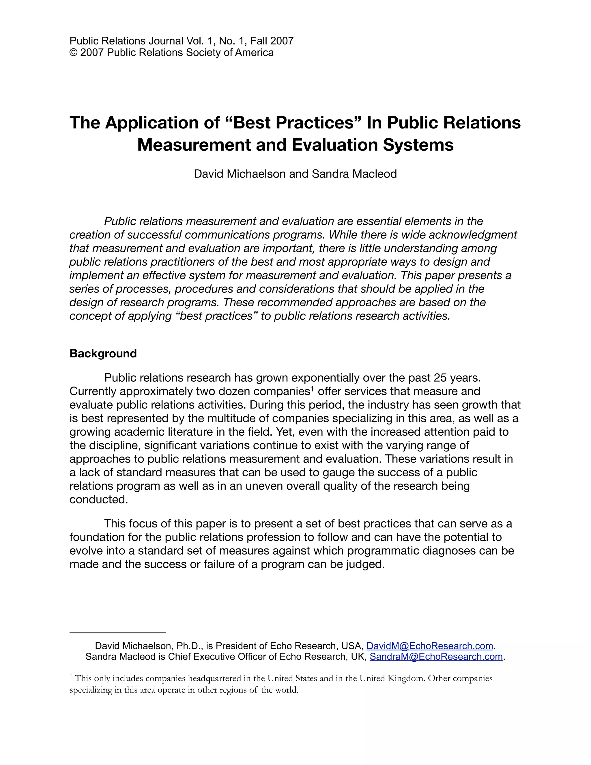 This document discusses best practices for public relations measurement and evaluation systems. It argues that current practices focus too narrowly on media outputs rather than target audiences. The paper presents nine best practices across research methods and measures that should form the foundation for public relations evaluation: 1) Clear and well-defined research objectives, 2) Rigorous research design and methodology, 3) Detailed documentation and transparency. Adopting these best practices can help standardize measurement and improve program effectiveness.