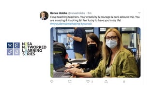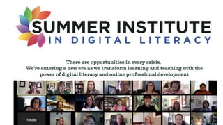 The document discusses best practices in digital learning, emphasizing the importance of deepening engagement and accelerating learning through relationships and guided inquiry. It highlights teachers' concerns about the rapid pace of digital tools and their vulnerabilities in adopting online teaching methods, while also presenting the pandemic as a crisis that offers opportunities for educational growth. Overall, it advocates for collaborative learning experiences and the incorporation of media literacy in digital education.
