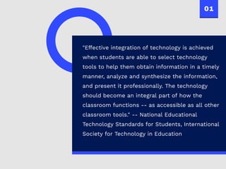 The document discusses best practices for effective technology integration in education, emphasizing that seamless integration occurs when technology is routinely utilized to improve learning experiences. It highlights the necessity of managing change within school organizations, ensuring stakeholder involvement, and viewing change as a positive opportunity for growth. Additionally, it addresses funding considerations and community outreach using technology to enhance communication and engagement with families.