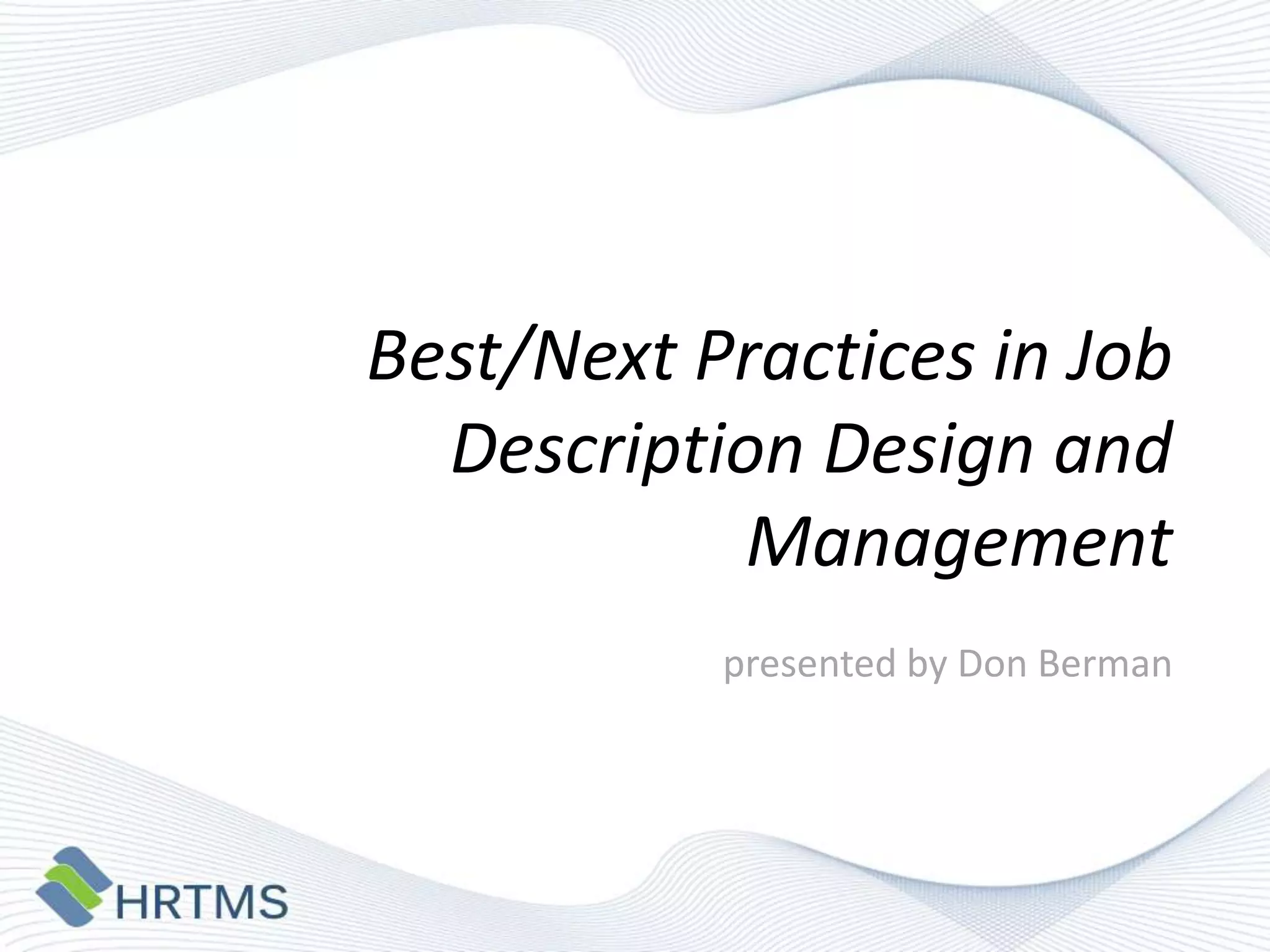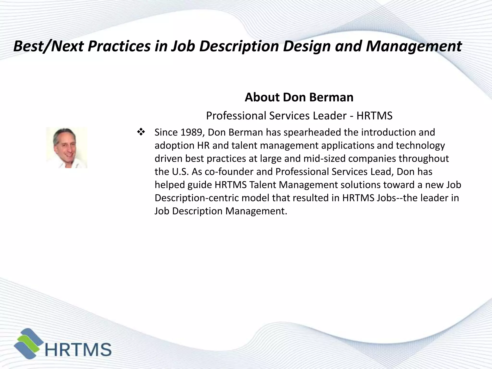 Don Berman, a leader in HR and talent management, emphasizes the importance of effective job descriptions in the hiring process and overall talent management. He outlines best practices for designing job descriptions, addressing common issues such as lack of structure, legal considerations, and the need for collaboration among stakeholders. The document serves as a guide to create job descriptions that accurately reflect job roles and support organizational objectives while remaining compliant with legal standards.