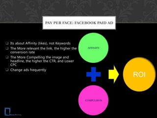 This document provides 52 tips and best practices for improving results and lowering costs per click from Facebook ads. Some key tips include targeting audiences based on affinity rather than keywords, using compelling images and headlines to increase click-through rates and lower costs, frequently testing and rotating ads, and creating targeted ad groups based on demographics and location. It also recommends studying top-performing content to inform creative design and copywriting approaches.
