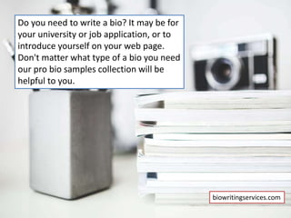 The document provides a collection of professional bio samples for various professions, including real estate agents, photographers, artists, and executives, to assist individuals in writing their own biographies for applications or online profiles. Each bio example is tailored to specific industries and includes tips on how to create an engaging and effective biography. Additionally, the document offers resources for further guidance on professional bio writing.