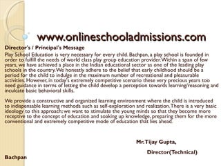 The document outlines the mission of www.onlineschooladmissions.com to connect parents with schools, highlighting the importance of early childhood education through various schools like Bachpan and Medhaam. These institutions emphasize nurturing creativity, experimentation, and a partnership with parents to foster responsible and socially aware children. Additionally, Gold Field Public School aims to provide a dynamic and progressive educational experience that prepares students for lifelong learning and adaptability.