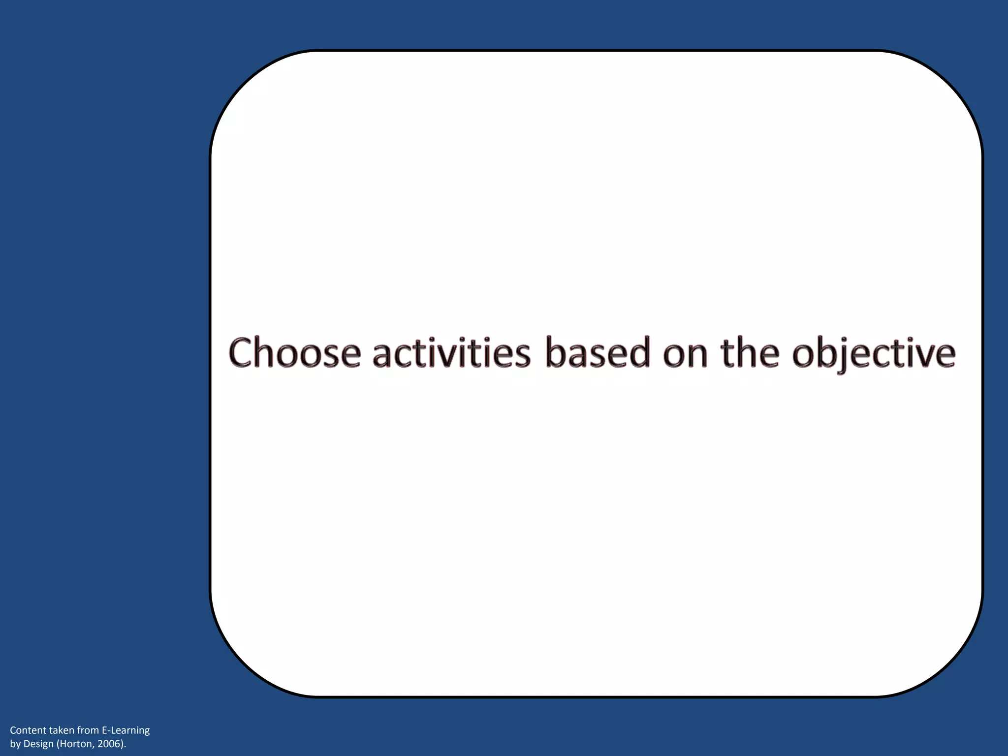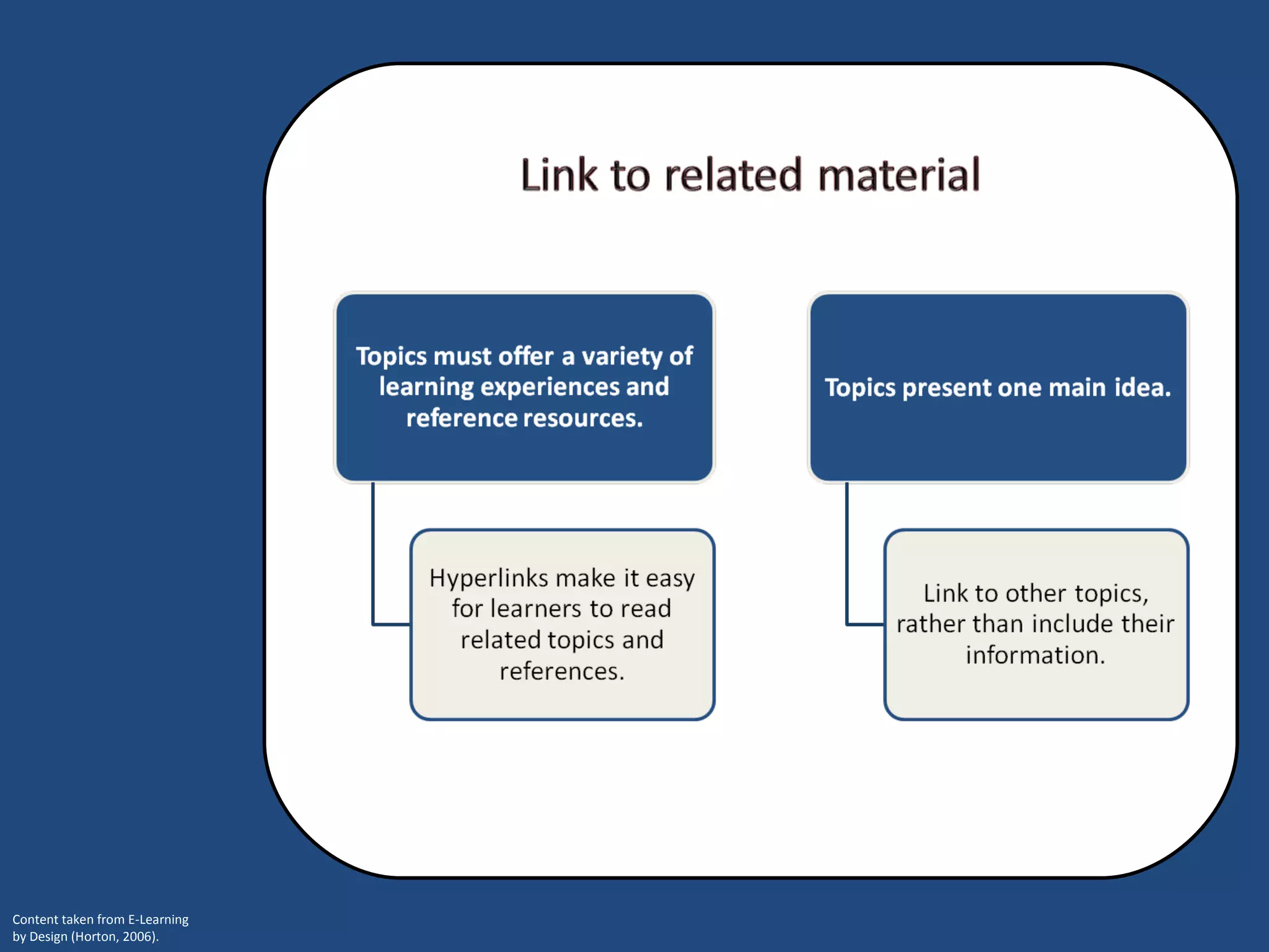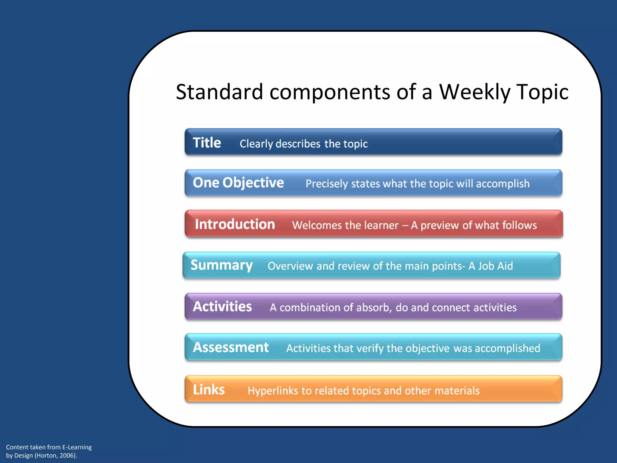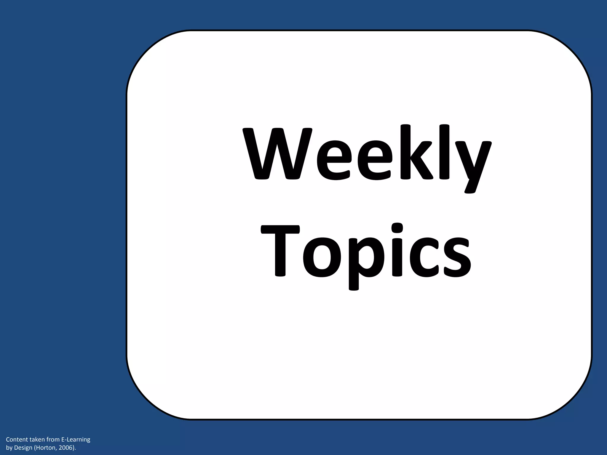 Weekly topics in online courses aim to achieve a single learning objective through various components. These components include an objective, title, introduction, content that teaches new skills or information, a summary, and assessment. Together, these elements are designed to help learners absorb new knowledge, practice skills, and demonstrate they have met the overall learning goal stated in the objective.