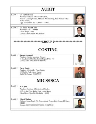 This document provides rankings of the best teachers and coaching academies in Delhi for CA final exams in 2016. It lists the top 2 teachers for subjects like Accounts, SFM, Law, Audit, Costing, MICS/ISCA, Indirect Tax, and Direct Tax. Contact information is provided for each academy. It clarifies that this list is based on feedback from students who cleared CA exams in June 2016, and is intended to help students selecting coaching classes, not for those preferring self-study. The list is asserted to represent the best CA coaching options available.