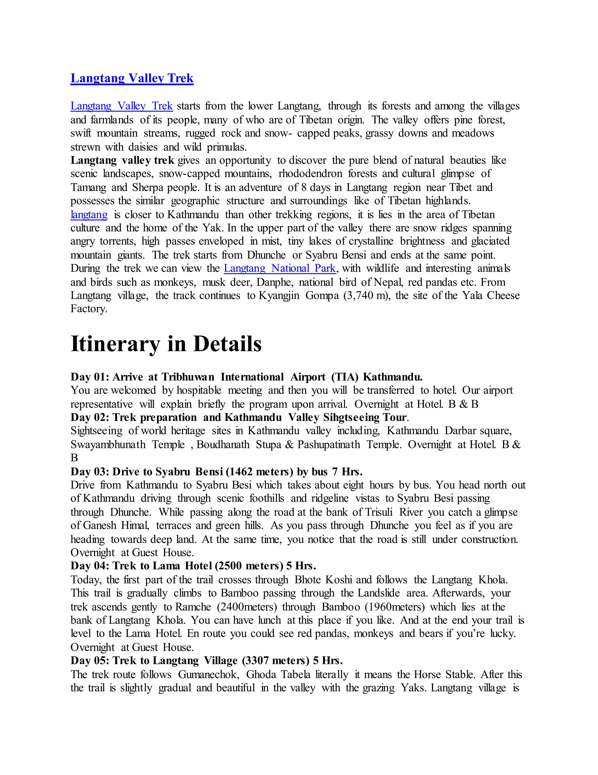 The Langtang Valley Trek is an 8-day adventure starting from Syabru Bensi, offering stunning landscapes, Tibetan culture, and diverse wildlife in the Langtang National Park. The journey includes various scenic stops such as Langtang Village and Kyangjin Gompa, with opportunities for exploration and acclimatization among snow-capped peaks and rhododendron forests. The trek provides a glimpse into local Tamang and Sherpa communities while allowing for exploration of the natural beauty along the way.