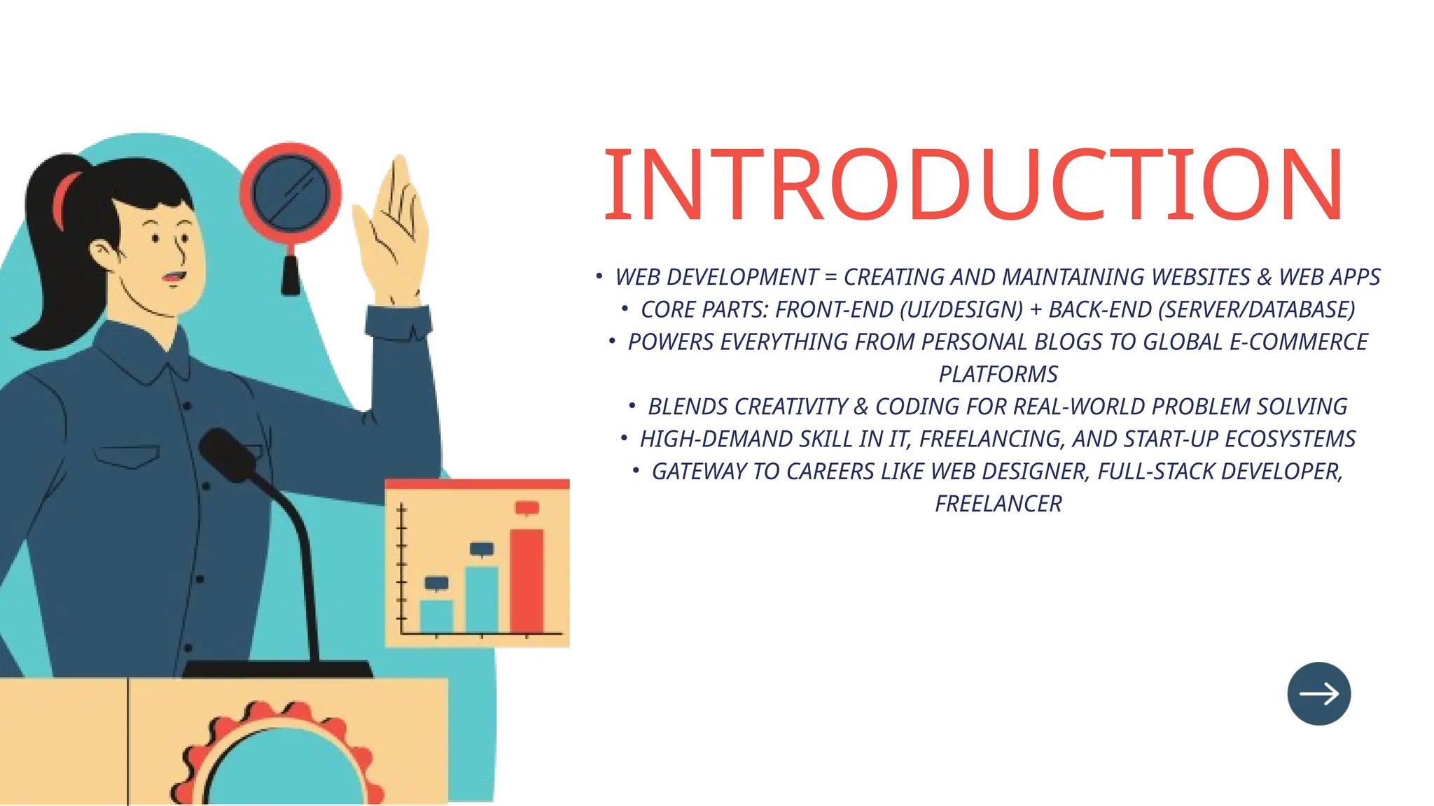 • WEB DEVELOPMENT= CREATING AND MAINTAINING WEBSITES & WEB APPS