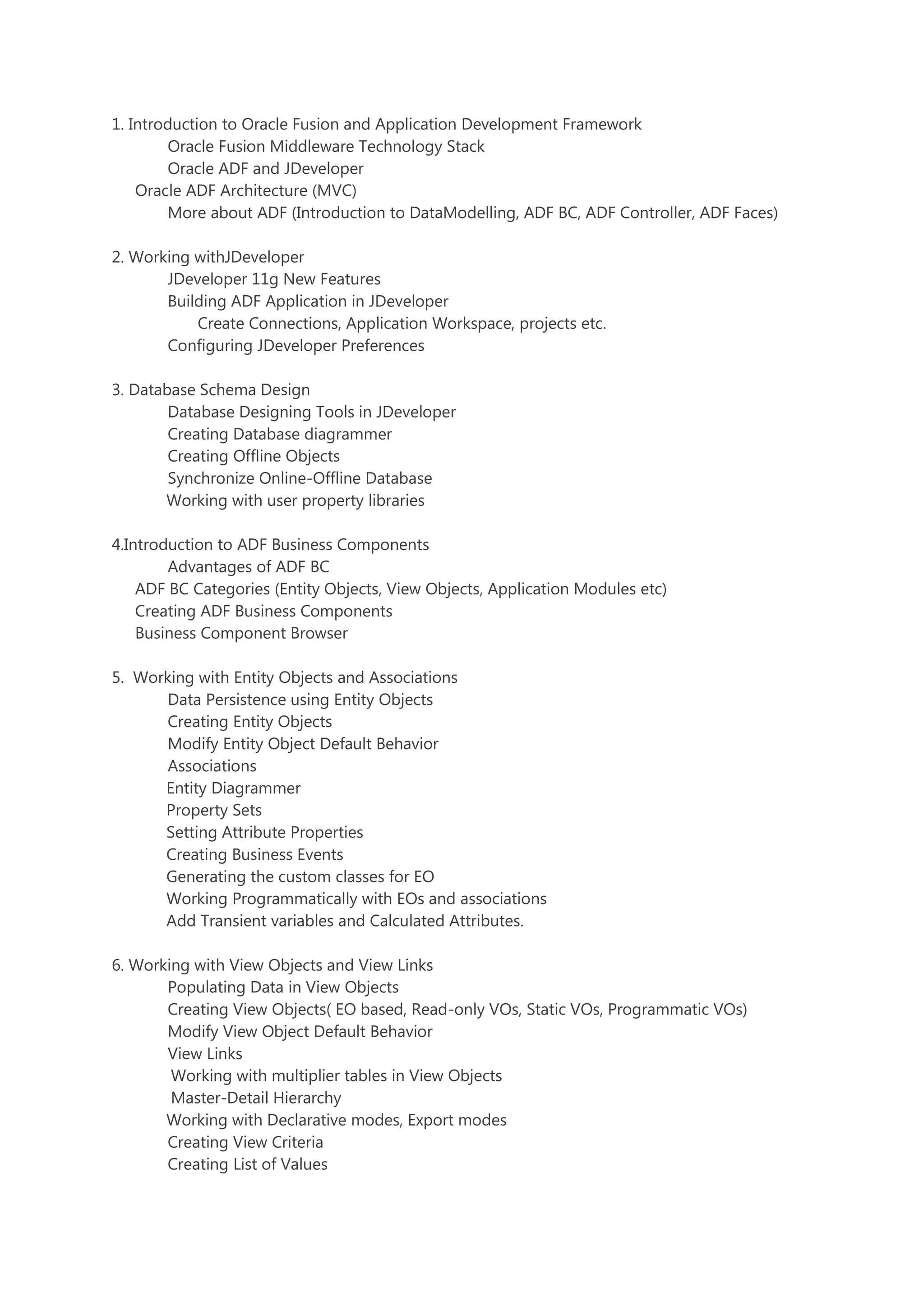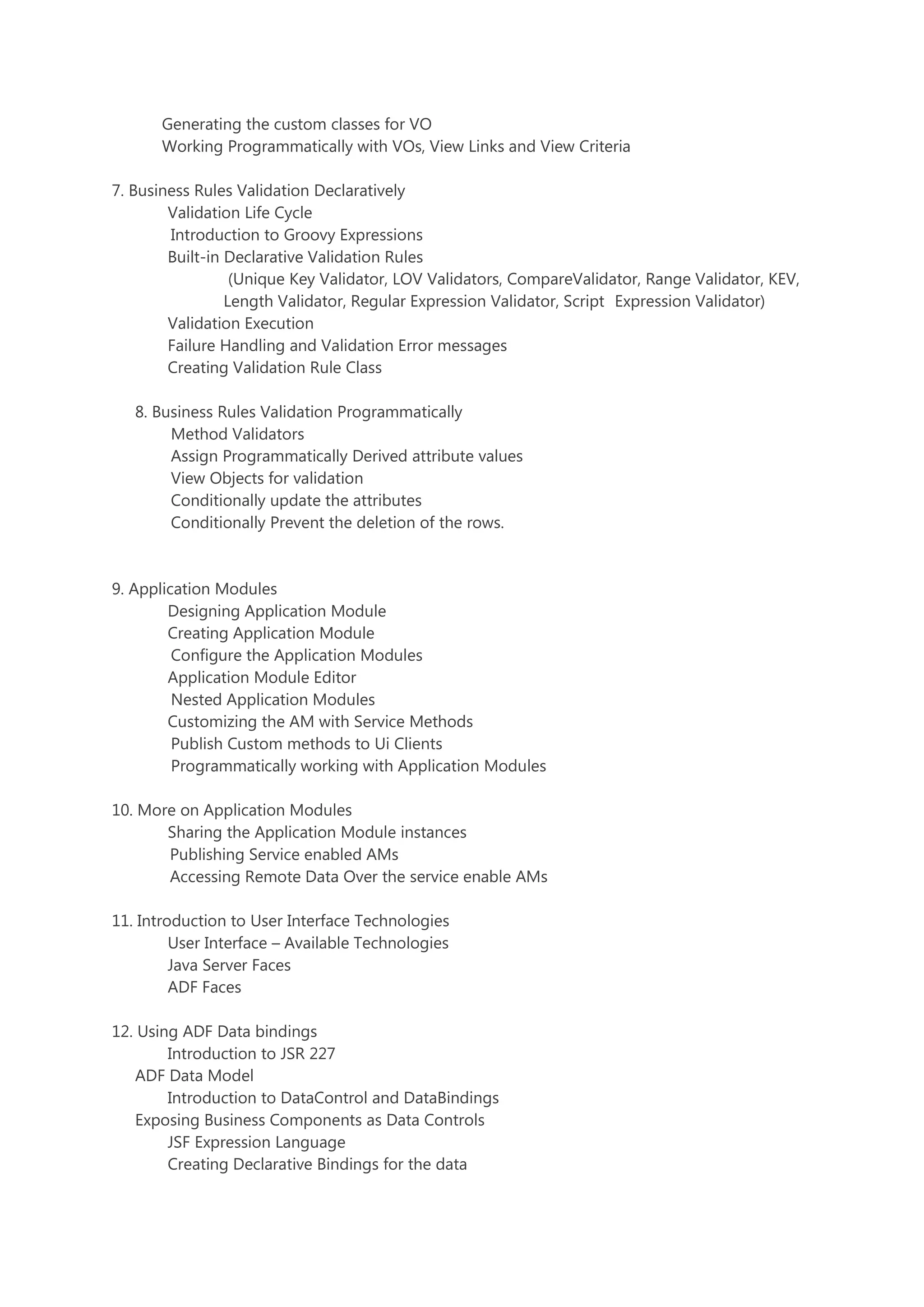 This document provides an overview of developing applications with Oracle Fusion Middleware technologies including Oracle Application Development Framework (ADF). It covers topics such as setting up the development environment with JDeveloper, designing database schemas and business components with ADF Business Components, building user interfaces with ADF Faces, creating task flows, ensuring reusability, handling data binding, validation and transactions, and deploying the finished application. The document is intended to guide developers through the full application development lifecycle with ADF.