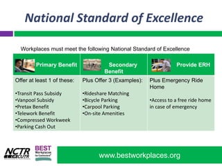 The document provides information about the Best Workplaces for Commuters (BWC) program, which recognizes workplaces that meet the National Standard of Excellence for commuter benefits. To be recognized, workplaces must offer an Emergency Ride Home program and actively promote commuter benefits to employees. Membership in BWC provides national recognition and benefits like networking opportunities and assistance resources. The annual membership fee is $230 per workplace, with discounts for multiple locations. The Center for Urban Transportation Research manages BWC to promote public transportation and recognize employer leadership in commuter benefits.