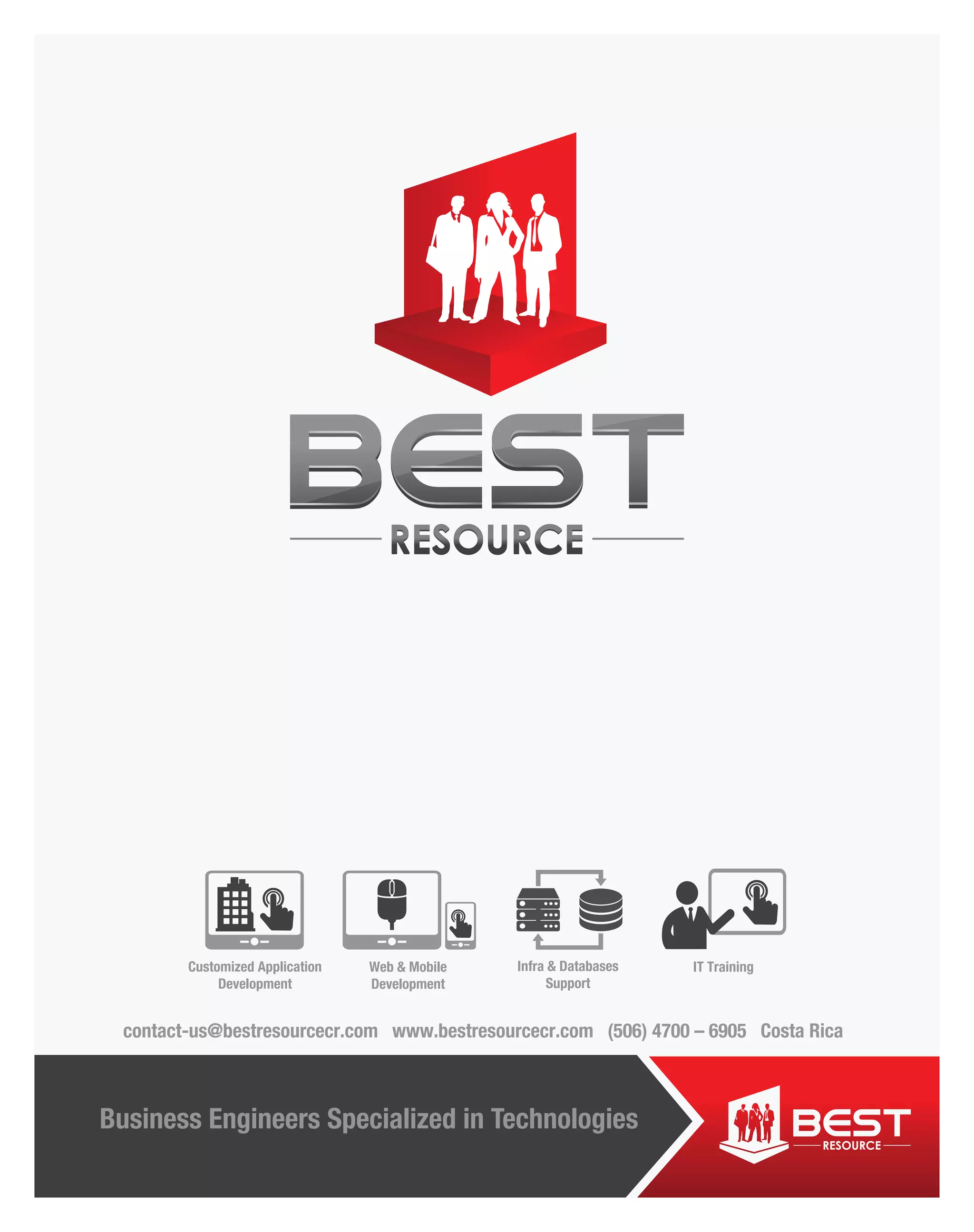 BEST RESOURCE is a Costa Rican IT consulting firm that offers customized software development, IT training, infrastructure support, and web/mobile development. Their team of experienced engineers and consultants work to become their clients' main technology partner and help solve business needs on time and on budget. BEST RESOURCE aims to demonstrate that outsourcing software management to an experienced team can deliver the technical and administrative expertise required to meet clients' requirements.