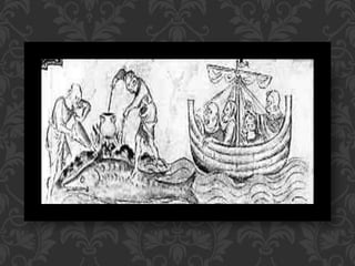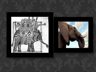 The document discusses how exotic animals like elephants were often inaccurately depicted in bestiaries. Elephants might be given incorrect physical attributes like hooves or strange ears. These visual depictions, as well as descriptions of their behavior, came from literary sources rather than from life. King Henry III of England was given a real elephant by the King of France, which was paraded through the streets of London, allowing people to see an actual elephant.