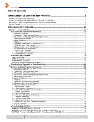 The U.S. Consumer Best Practices Version 6.0 document outlines guidelines for mobile marketing aimed at standardizing carrier business rules for off-deck services to enhance consumer experience. It details three pricing categories for short code programs: standard rate, premium rate, and free to end user, along with associated guidelines and best practices for each. The document also emphasizes the importance of consumer protection and privacy in the mobile marketing industry.