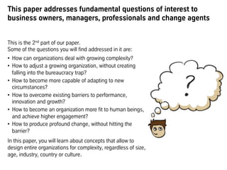 This document discusses designing organizations to be robust and adaptable in complex environments. It argues that organizations should be viewed as networks rather than hierarchical pyramids. Key points made include: