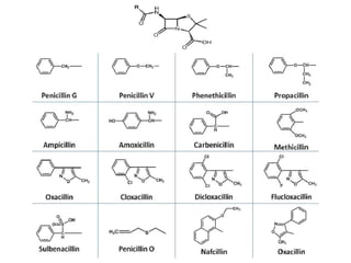 The document discusses various β-lactam antibiotics including penicillins and cephalosporins. It describes the chemical structure of penicillins including the β-lactam ring. It discusses the classes of penicillins, their history, mechanisms of action, degradation pathways, structure-activity relationships, resistance issues and classification. Specific penicillins discussed include benzylpenicillin, phenoxymethyl penicillin, methicillin, ampicillin, amoxicillin, oxacillin, cloxacillin and dicloxacillin.