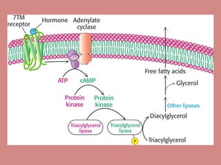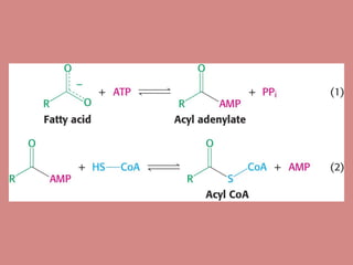 Fatty acid catabolism, or beta-oxidation, is the process by which fatty acids are broken down in the mitochondria to generate energy. The document outlines that beta-oxidation of palmitate, a 16-carbon fatty acid, yields 106 molecules of ATP through multiple steps where acetyl-CoA molecules are produced, generating 80 ATP equivalents total. NADH and FADH2 are also produced, contributing another 17.5 and 10.5 ATP equivalents respectively.