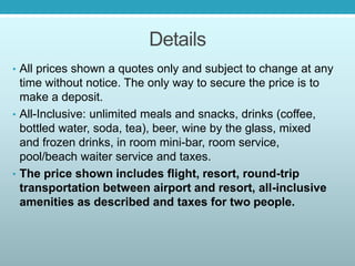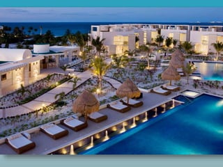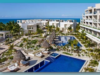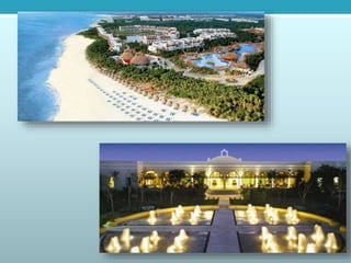 This document provides information on three vacation options in Mexico: 1) The Valentin Imperial Maya resort in the Riviera Maya offers an all-inclusive, adult-only experience with various dining options, pools, and room types. 2) The Hideaway at Royalton Riviera Cancun is an adult-only area within a larger resort offering exclusive amenities and access to restaurants and bars at the Royalton resort. 3) The Beloved Playa Mujeres is a 5-star boutique resort in Playa Mujeres, Mexico offering an all-inclusive, adult-only experience with two miles of beach and swimming pools.