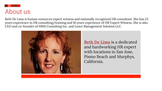 Beth De Lima is a nationally recognized human resources expert with 23 years of consulting experience and 16 years as an expert witness. She is the CEO and co-founder of HRM Consulting Inc. and has specialized roles in employment regulation compliance, litigation, and vocational rehabilitation. With locations in California and Seattle, she is also a certified mediator and member of the employee health, safety, and security special expertise panel.