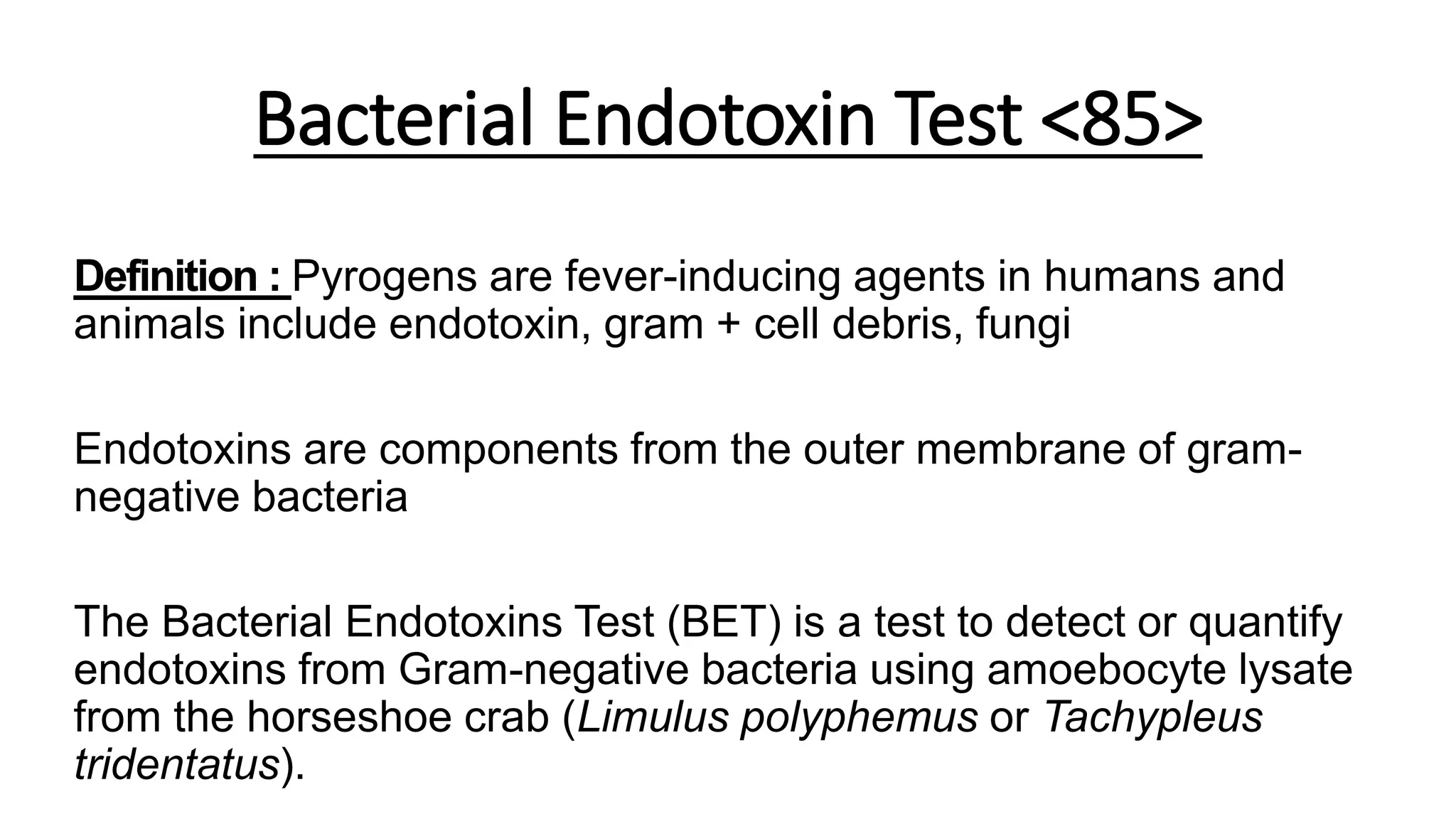 The document discusses the bacterial endotoxin test (BET) which uses the limulus amoebocyte lysate (LAL) from horseshoe crabs to detect endotoxins from gram-negative bacteria. The BET involves using LAL to detect endotoxins via gel clot tests or kinetic chromogenic/turbidimetric assays. Standards and sample solutions are prepared according to USP guidelines to determine if samples meet specified endotoxin limits. The kinetic LAL assays provide quantitative results while gel clot tests provide binary positive/negative results. Interference testing is also conducted to identify non-interfering sample dilutions for accurate BET results.