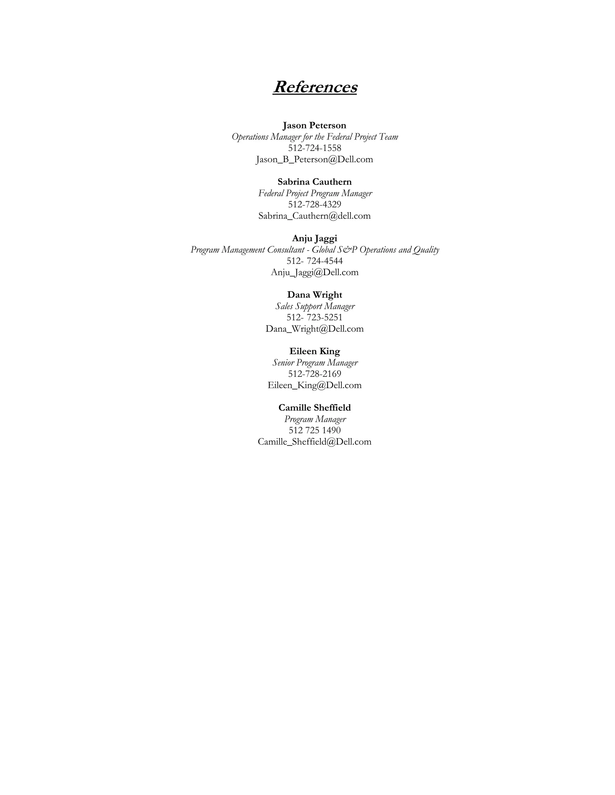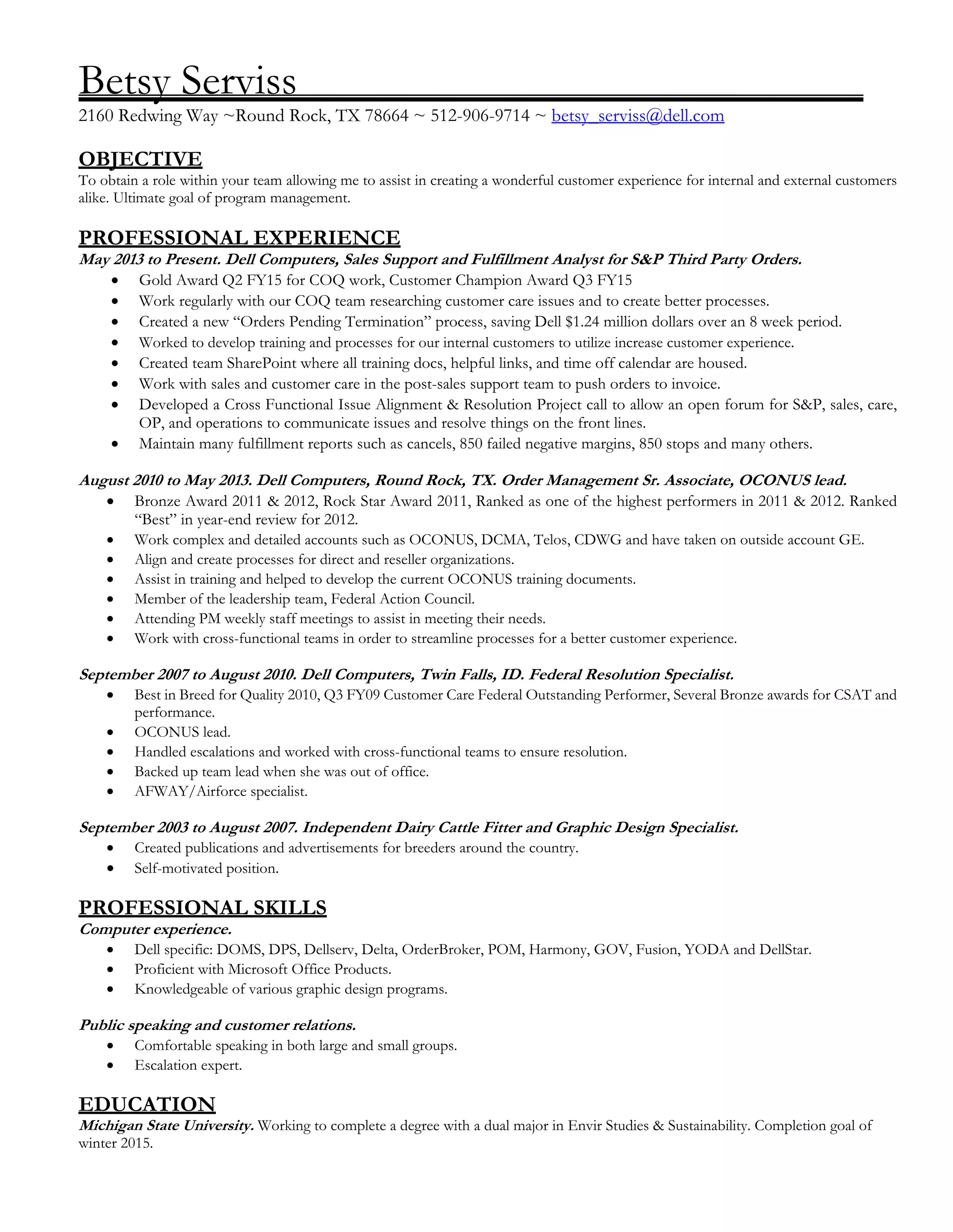 Betsy Serviss has over 10 years of experience at Dell in sales support, order management, and customer service roles. She has received numerous performance awards for her work developing new processes, saving the company money, and improving the customer experience. Her objective is to obtain a program management role where she can continue assisting customers.