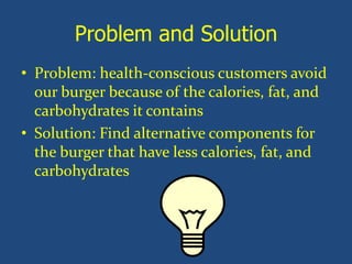 The document proposes building a healthier burger option by finding alternatives to the existing bun and cheese that have lower calories, fat, and carbohydrates. Specifically, the alternative bun has 140 calories, 2g fat, and 27g carbs compared to 260 calories, 5g fat, and 45g carbs in the original bun. The alternative cheese has 70 calories, 4g fat, and 1g carbs versus 125 calories, 9g fat, and 1g carbs in the original cheese. Combining these alternatives results in a "better burger" with 410 calories, 19g fat, and 28g carbs rather than 585 calories, 27g fat, and 46g carbs in the original.