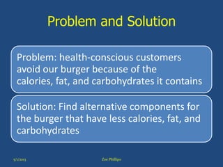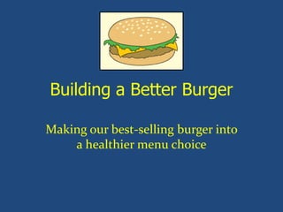 The document discusses building a healthier burger option by finding alternatives to the existing bun, cheese, and other components to reduce calories, fat, and carbohydrates. It analyzes the nutrition of the current bun and cheese and proposes alternative ingredients that would lower the total calories from 585 to 410, total fat from 27g to 19g, and total carbohydrates from 46g to 28g to make the burger a healthier choice for health-conscious customers.
