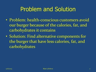 The document discusses building a healthier burger option by finding alternative components that have fewer calories, fat, and carbohydrates than the standard burger. It analyzes the nutrition of the current bun and proposes an alternative with 140 calories, 2g fat, and 27g carbs compared to 260 calories, 5g fat, and 45g carbs for the standard bun. It also compares the nutrition of the current 585 calorie, 27g fat burger to a potential 410 calorie, 19g fat improved burger using alternative buns and cheese.