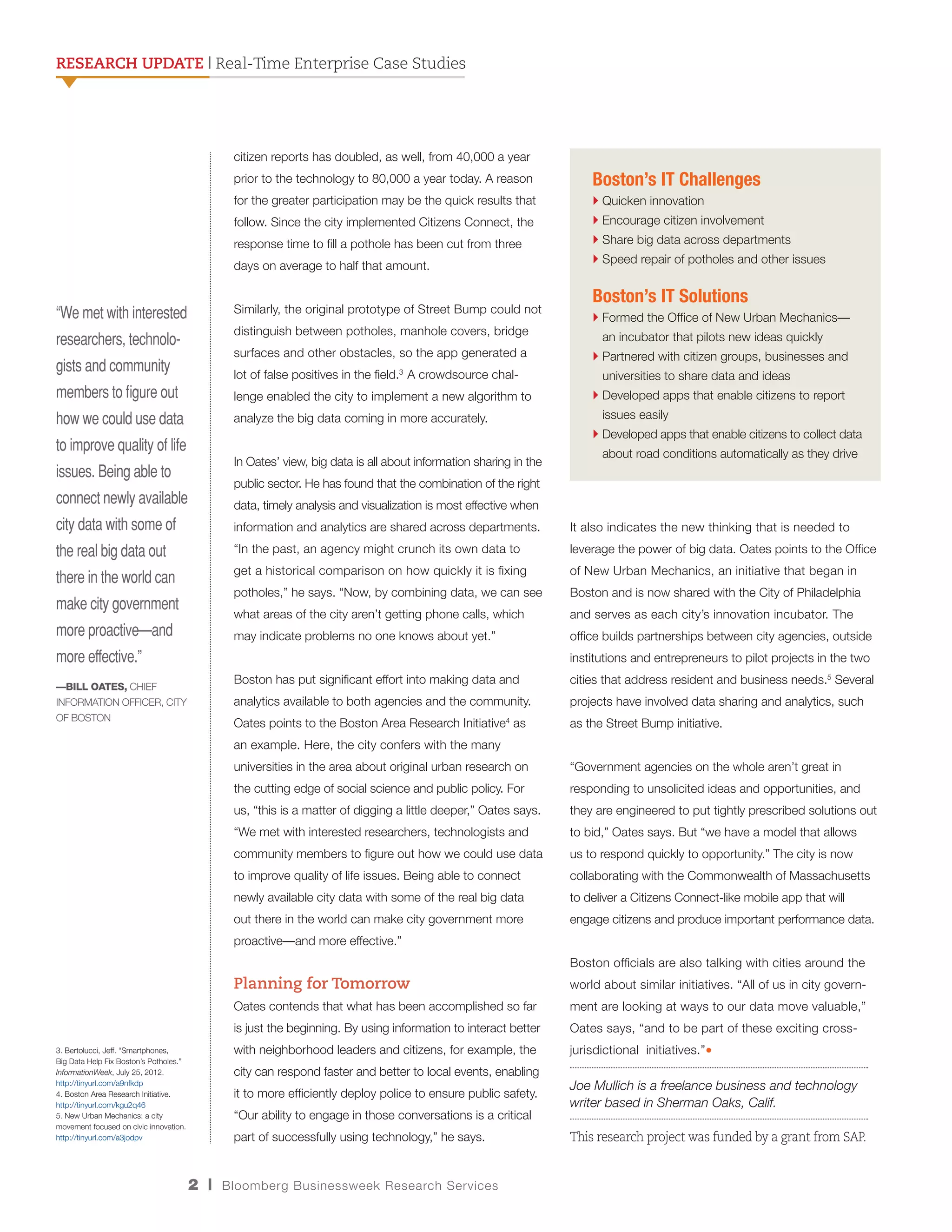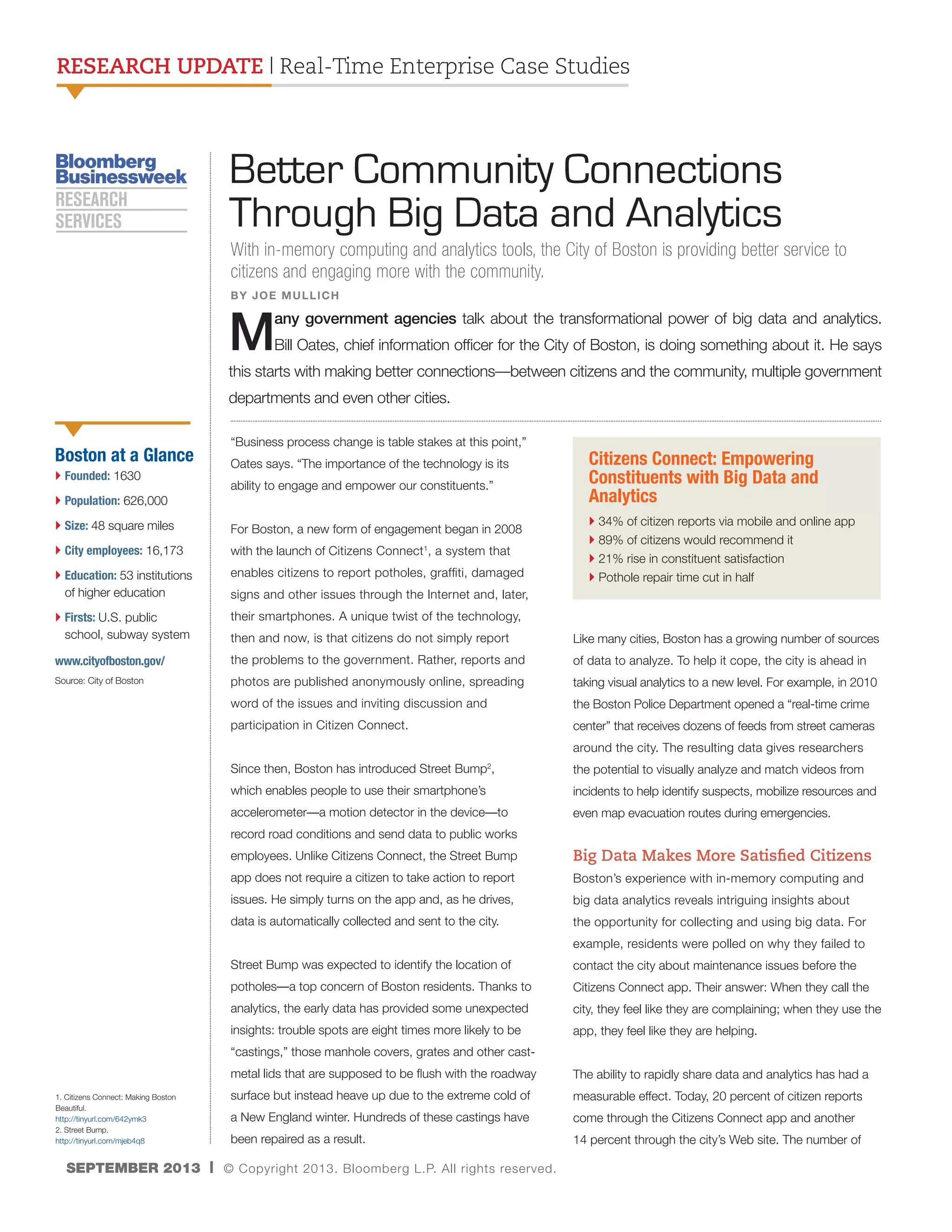The city of Boston is leveraging big data and analytics to enhance citizen engagement and improve municipal services, with tools like Citizens Connect and Street Bump enabling real-time reporting and data collection. Since implementing these technologies, citizen satisfaction has increased and pothole repair times have significantly decreased. The city's collaborative approach involves partnerships with local researchers and institutions to use data for better public service delivery.