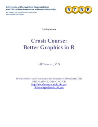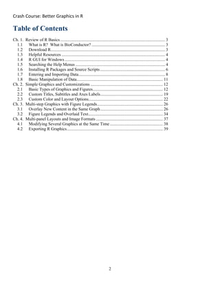 This document provides a training manual on better graphics in R. It begins with an overview of R and BioConductor and reviews basic R functions. It then covers creating simple and customized graphics, multi-step graphics with legends, and multi-panel layouts. The manual aims to help researchers learn visualization techniques to improve the communication of their data and results.