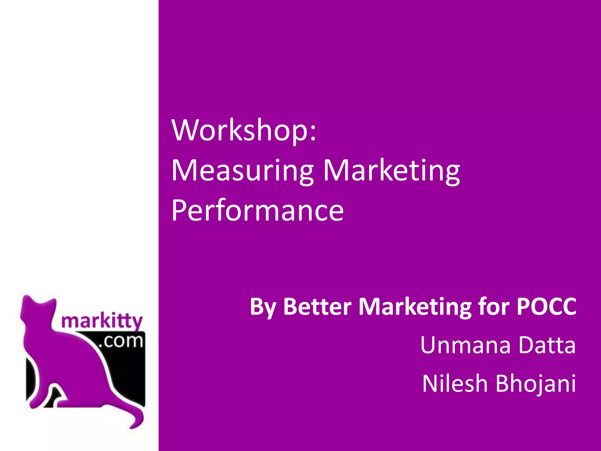 The document outlines how to measure marketing performance by aligning business and marketing objectives, defining key metrics like reach, engagement, leads, and retention, and using tools like Google Analytics, Facebook Insights, and email marketing platforms to track metrics at different stages of the customer purchase funnel from awareness to repeat purchases. It also provides examples of common online marketing metrics and holds a group exercise to help attendees identify their objectives, activities, and metrics.
