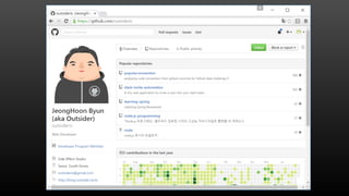 아웃사이더님의 룰 •의미 없는 커밋은 하지 않는다. •치팅은 하지만 어뷰징은 하지 않는다. •사이드 프로젝트 외에도 오픈 소스에 대한 공헌을 늘려간다. •아무리 바빠도 일일 커밋을 최대한 한다. •공개 저장소에 커밋하는 내용을 기준으로 한다.
