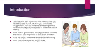 The document provides strategies for improving writing skills, emphasizing the importance of personal experience, collaboration, and various prewriting techniques such as free writing and listing ideas. It encourages students to focus on their interests, use diverse evidence, and maintain a positive attitude toward writing. The conclusion highlights the necessity of patience and practice in developing writing abilities.