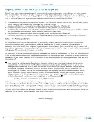This document provides best practices for investor relations around corporate spinoffs based on interviews with IROs who have experienced spinoffs. Some key points: