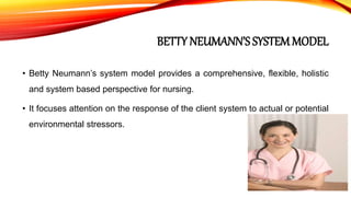 Betty Neumann's System Model provides a holistic framework for nursing focusing on how clients respond to stressors. It views clients as unique systems composed of physiological, psychological, socio-cultural, developmental, and spiritual subsystems that interact with internal and external environments. The model emphasizes primary, secondary, and tertiary prevention to help clients maintain wellness in response to stressors and regain stability if needed.