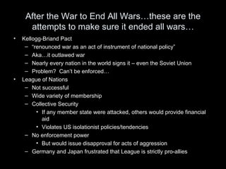 Between the 1920s and 1930s, several attempts were made to prevent future wars in Europe after World War 1, but they faced challenges. The Kellogg-Briand Pact outlawed war but lacked enforcement. The League of Nations struggled due to its diverse membership and lack of enforcement powers. Meanwhile, countries like Germany, Italy, and Spain faced economic and political instability during this interwar period known as the "Age of Anxiety."