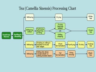 This document provides information about various types of beverages. It discusses carbonated drinks such as soda that are charged with carbon dioxide, giving them effervescence. Mineral water comes from underground springs and contains dissolved minerals. Squash is a fruit concentrate diluted with water. Popular juices are made by squeezing or macerating fresh fruits and vegetables. Syrups are thick, sweet liquids used as flavorings. Tea comes from the Camellia sinensis plant and can be black, green, oolong or white depending on processing. Coffee is made from coffee beans, which are harvested, processed by removing the outer layer, roasting, grinding, and brewing to make the beverage.